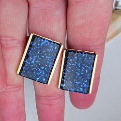 Ett par rektangulära manschettknappar med en blå emaljliknande färg och en liten silverfärgad kvadrat inuti.