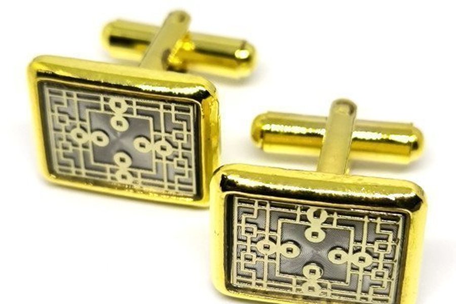 Ett par rektangulära manschettknappar i guldfärg och silverfärg med ett intrikat mönster.