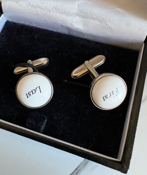 Manschettknappar med texten "first" på den ena och "last" på den andra. Knapparna är runda med vit botten och svart text. De levereras i en svart ask med vit insida.