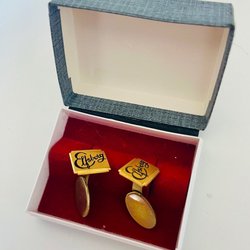 Ett par eleganta manschettknappar i en gyllene färg med en mörk sten i mitten. Perfekt för att addera en sofistikerad touch till din outfit.