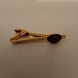 Ett slipsnål med Manhattan Finest Quality Computer Products logotyp. Den har en guldfärgad metallbas med en vit rektangel som innehåller logotypen i blått och svart.