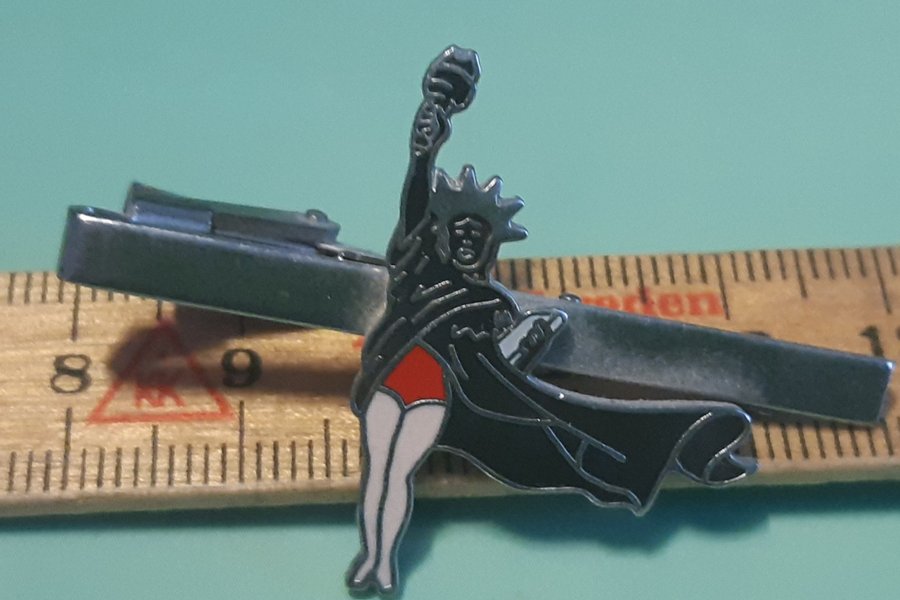 Ett unikt slipsnål med en humoristisk twist på Frihetsgudinnan. Denna slipsnål har en detaljerad design av Frihetsgudinnan, men med en oväntad och lekfull detalj: hon bär röda trosor. En rolig accessoar som garanterat kommer att väcka uppmärksamhet och skapa samtalsämnen.