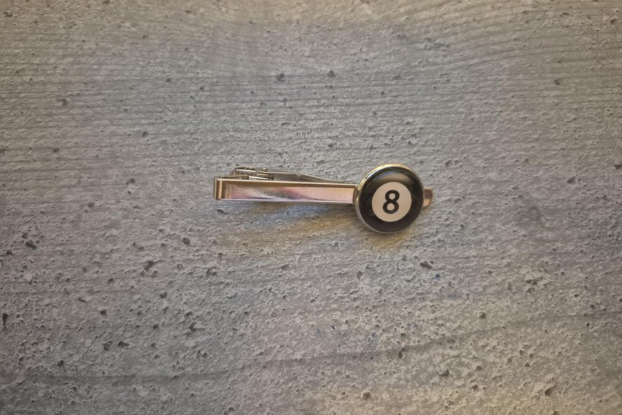 Ett slipsnål med en åtta-boll design. Perfekt för biljardentusiasten eller för att lägga till en unik detalj till din outfit.