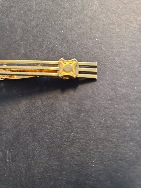 Elegant slipsnål i guldfärg med en dekorativ mittdel. Designen har rena linjer och en klassisk estetik, vilket gör den till en stilfull accessoar för formella tillfällen eller för att komplettera en välklädd outfit. Den är utformad för att hålla slipsen på plats med en diskret men ändå iögonfallande detalj.