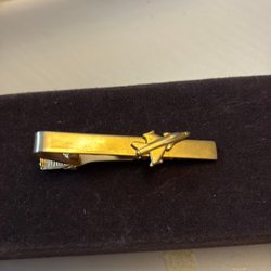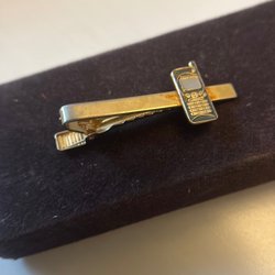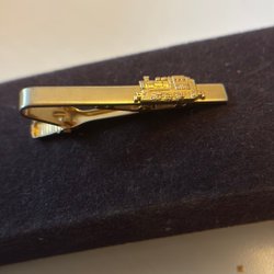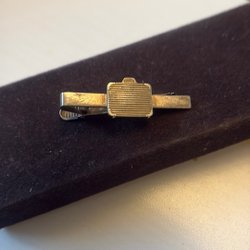 En slipsnål i gul med en svart T-logotyp. Slipsnålen har en klassisk design och är ett stilfullt tillbehör.