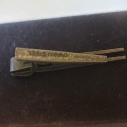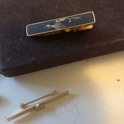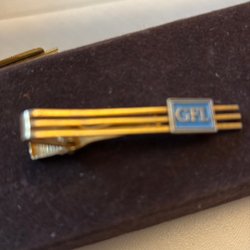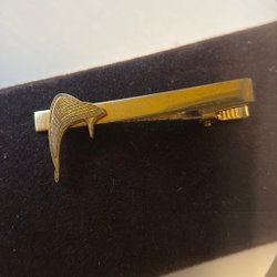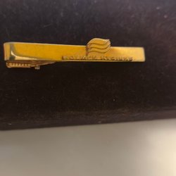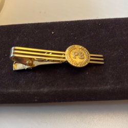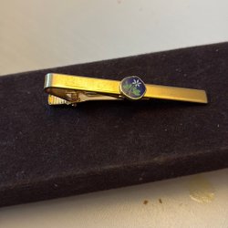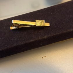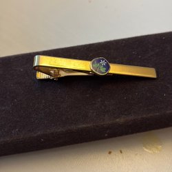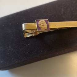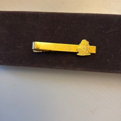 En slipsnål i guldfärg med en blå och svart detalj som har bokstaven ”T” på sig. Slipsnålen har en klassisk design och är ett stilfullt tillbehör.