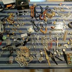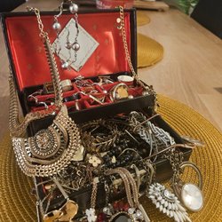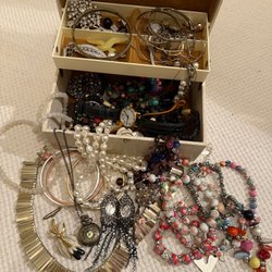 Ett stort sortiment bijouterier av halsband, armband, ringar, broscher, örhängen och hängen i olika stilar och material. Perfekt för den som älskar att variera sin smyckesgarderob. Örhängena, de flesta är för hål i öronen, finns några clips.
