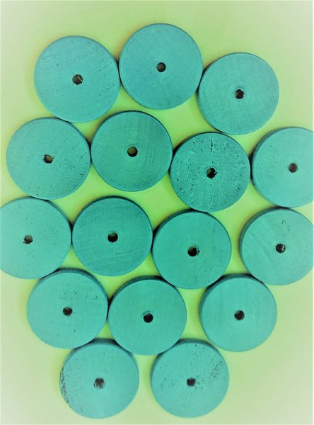 16 himmelsblå, runda platta träpärlor. Diameter 25 mm. Tjocklek 3 mm. Ej använda.