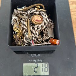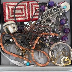 Säljer en samling bijouterier från dödsbo. Vikten på bijouterierna är 516 gram. Blandning av armband, halsband, örhängen mm!