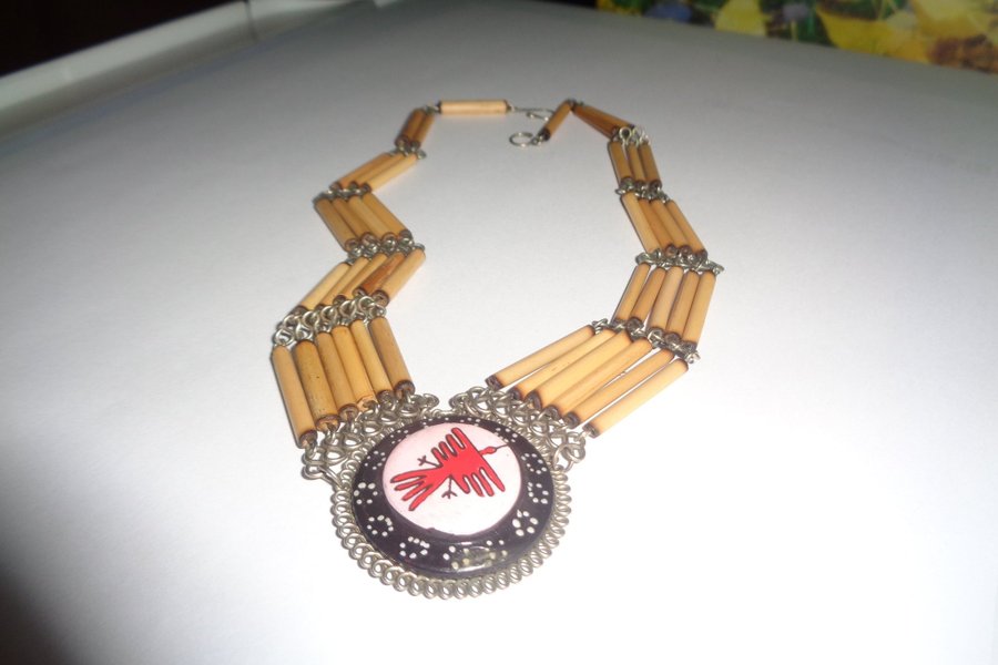 Halsband 37 cm i omkrets, material i trä och metall. Motivet kan vara Fågel Fenix.