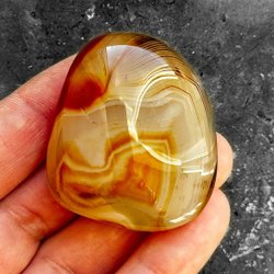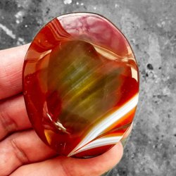 Med en hårdhet på 6,5–7 på Mohs skala är sardonyx en hållbar och väl lämpad sten för hantering. Den högpolerade ytan framhäver stenens dramatiska bandning och färgkontraster, medan den jämna äggformagen gör den till en perfekt handsten eller elegant dekorationspryl.