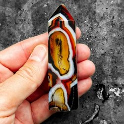 Med en hårdhet på 7 på Mohs skala är detta en hållbar sten som är väl lämpad för hantering och uppvisning. Den naturligt formade kristallens yta, som ofta är delvis polerad, framhäver de vackra bandade mönstren och den inre strukturen. Denna unika kombination av färg och mönster gör den till en mycket dekorativ pryl, ett eftertraktat samlarobjekt för mineralintresserade eller en mycket speciell presentidé.