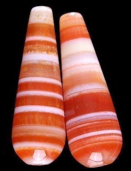Vacker, droppformad AGATsten med randmönster i tegelröda nyanser och vitt. Längd ca 28mm. Borrad på längden. Auktionen avser 1 sten.