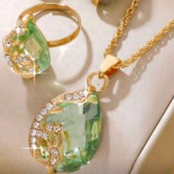 Ett stilrent och iögonfallande smyckeset bestående av ett armband och en ring i KC-guldpläterad.Designen bygger på flera tunna, öppna band som ger en modern och luftig känsla. Varje band pryds av glansfulla, smaragdgröna stenar i olika storlekar och former — både runda och avlånga cabochonliknande infattningar som skapar en exklusiv touch.