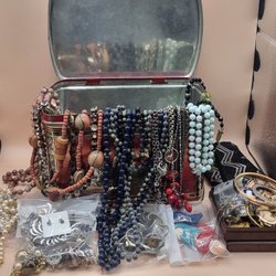 Ett sortiment av olika smycken. Inkluderar halsband, armband, ringar och en klocka.