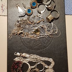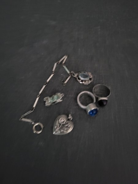 En lot med silversmycken förutom en ring som är i tenn. Armbandet är 18cm med lås. Behöver putsas!