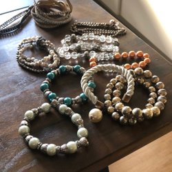 Två halsband, ett armband, fyra par örhängen, en berlock och en ring.