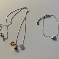 Paket Bijuteri: Halsbandet Edblad, silver 925 stämplad med hänge grön aventurine, Pilgrim halsband och armband. Allt är i jättebra skick.