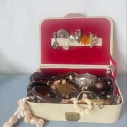 En smyckesamling med blandade vintage smycken, allt från ringar, halsband, armband, broscher och örhängen. Perfekt för dig som vill starta en smyckessamling. Defekter kan förekomma och varan säljs i befintligt skick så titta noga på bilderna innan bud!