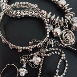 Parti bijouterier, halsband, broscher, pins, armband, skjortknappar, sjal klämma, örhänge. Märke och skador kan förekomma.