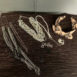 Två halsband ca 45cm och ett 55cm, fyra ringar ca 17mm (ej silver). Säljes tillsammans.