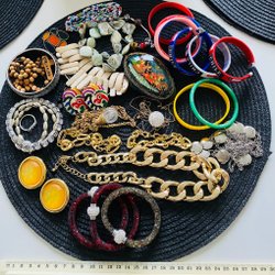 Två halsband ca 45cm och ett 55cm, fyra ringar ca 17mm (ej silver). Säljes tillsammans.