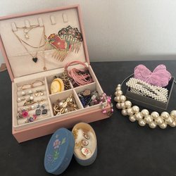 Parti smycken...Halsband, Armband,broscher, Örhängen, nål, tenn, manschettknappar,