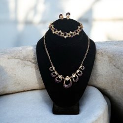 Halsband och armband i mörkgråa, lite tunga pärlor. Halsbandet har ett hjärthänge. I princip oanvänt. 30 år gammalt.