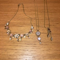 Guldfärgat halsband med svarta stenar.
