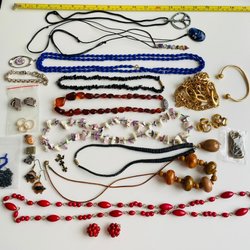 Ett antal bijouterier - 3 halsband, 2 armband, 1 ring, 2 par örhängen och ett hårspänne.