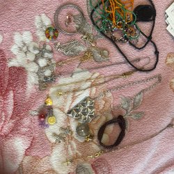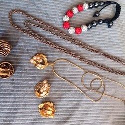 Halsband, armband, 3 ringar, 1 par örhänge med klips och 1 par för hål. Behöver lite kärlek och omvårdnad.