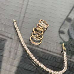 super fint set med 2 armband med strass stenar ett med rosa detalj & ett med vita stenar, 7 ringar som jag inte vet storlek eller material på men varierande för en hand! Allt i nyskick och armbanden är i stainless steel och har stämpel
