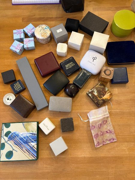 Ett part med ett 30-tal presentaskar/smyckesetuier. Gamla och nya.