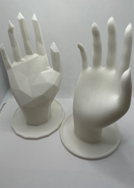 Två dekorativa handskulpturer i olika utföranden. Den ena har en modern, geometrisk design medan den andra har en mjukare, mer traditionell form. Perfekta som inredningsdetaljer. Håller dina ringar på ett fint sätt.
