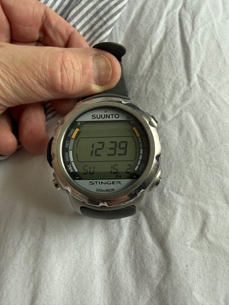Suunto Stinger dykdator i gott skick. Klockan visar tid, datum och har dykfunktionalitet. Vattentät till 200m/660ft.