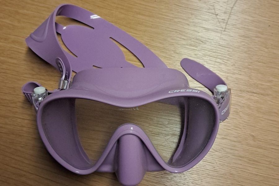 Dykmask från Cressi i lila färg. Masken har "TEMPERED" och "CE" tryckt på glaset.