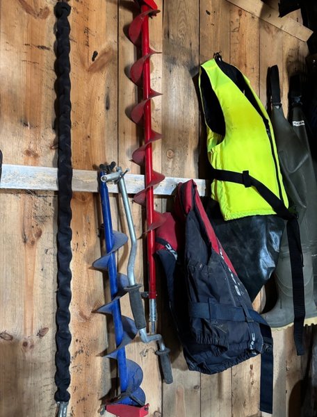 Komplett isfiske utrustning med handdriven birr och NY borr driven av skruvdragare. Spön, blänken, mormyskor. (Mer bilder kommer snart)