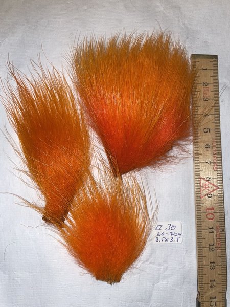 färgad orange, hårlängd ca.60-70 mm , skinnbiten ca. 25x25 mm, Mycket fin kvalitet enlig min uppfattning. Svårt att få tag på.