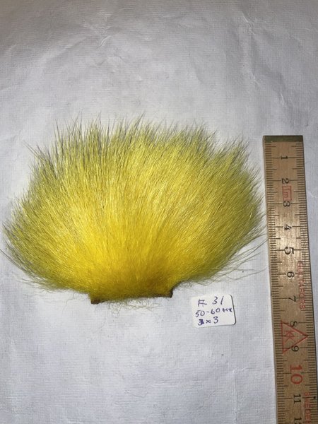 färgad gult, hårlängd ca.50-60 mm , skinnbiten ca. 30x30 mm, Mycket fin kvalitet enlig min uppfattning. Svårt att få tag på.
