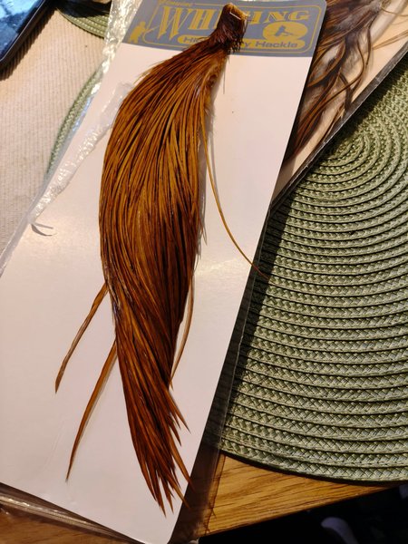 Fjädermaterial i längder (sadel-/cape-fjädrar) för flugbindning/fiske. Brunrödbruna fjädrar med mörkare stråk och vita partier, förpackningsetikett med texten "HALF SADDLE".