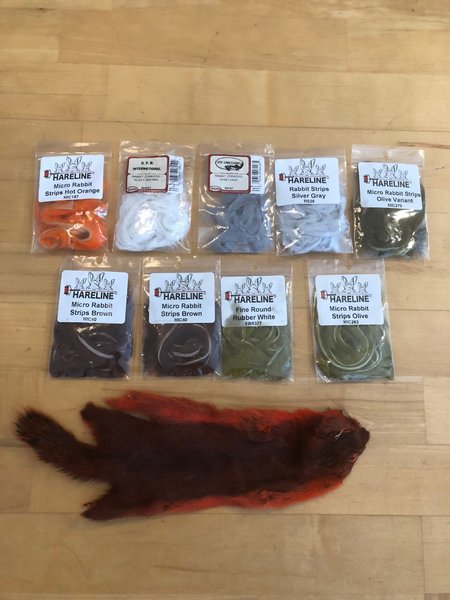 Zonkerstrimlor av kanin samt ett ekorrskinn. Etiketterna stämmer inte helt på alla påsar. Tagit nån bit här och där men mycket är dock helt obrukat. Ekorrskinnet är orange.