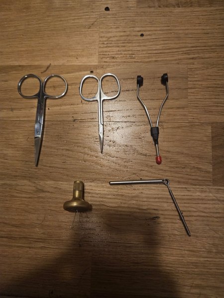 Denna sats innehåller flera verktyg som används för flugbindning enligt bild ovan.