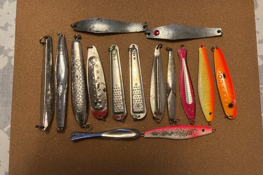 15 stycken torskpilkar i vikter från 65 till 240 gram.
