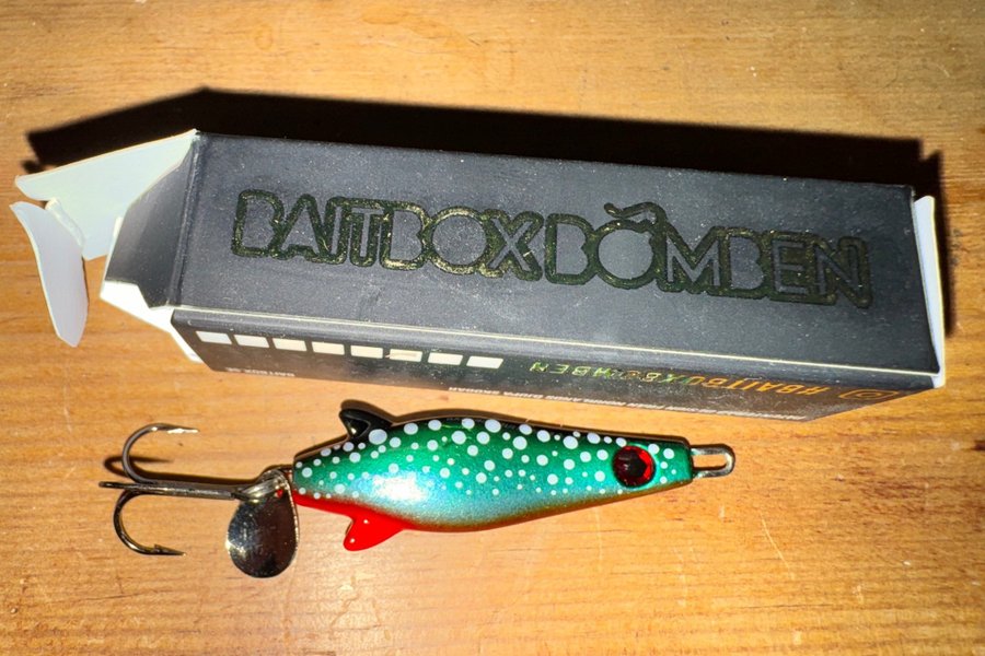 Fiskebait med patenterad design från Norrlands djupa skogar. Utrustad med en röd sked och treblekrok. Passar för olika typer av fiske.