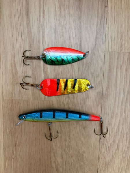 Fiskedrag, 4 stycken - liten spinnare 1g, 2 skeddrag 12 respektive 16 g och gädd drag 13 g. Det fjärde missades på bilden men ingår