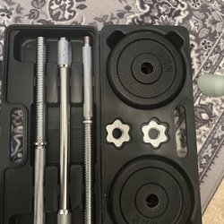 Komplett hantelset med vikter och stänger i en praktisk förvaringslåda. Perfekt för hemmaträningen.