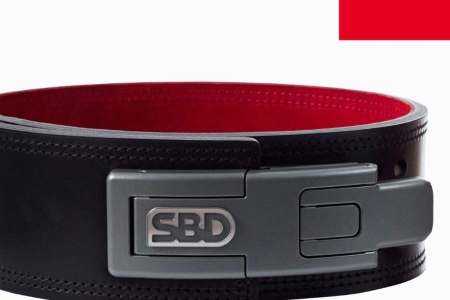 SBD 10 mm (Large) bälte i svart och rött. Bältet är tillverkat för att ge stöd vid styrketräning och är utrustat med en spänne i metall med SBD-logotyp.