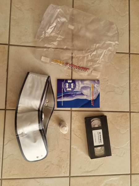 Ab Energizer träningsbälte med tillbehör. Inkluderar instruktionsmanual, viktminskningsguide och träningsvideo.