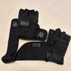 Ett par träningshandskar för styrketräning eller annan träning. Handskarna är svarta och är ställbara rund handleden.