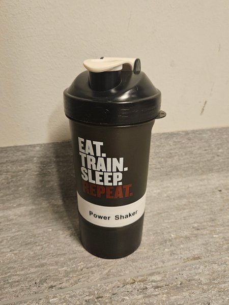 En svart Power Shaker med texten 'Eat Train Sleep Repeat'. Perfekt för gymmet! Går att lossa i flera delar som har plats för såväl vätska som ingredienser eller toppings.